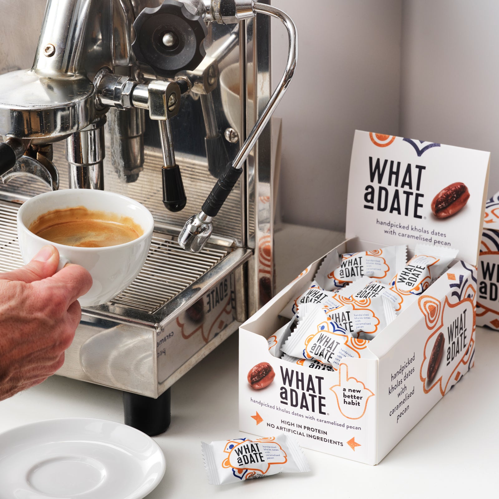 The finest pecan nut we could find, dipped in a very fine layer of crunch. Just enough to give the perfect bite. Meticulously matched with our sweeter flaky date.