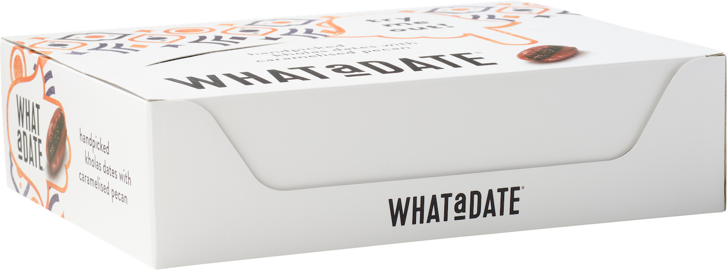 The finest pecan nut we could find, dipped in a very fine layer of crunch. Just enough to give the perfect bite. Meticulously matched with our sweeter flaky date.